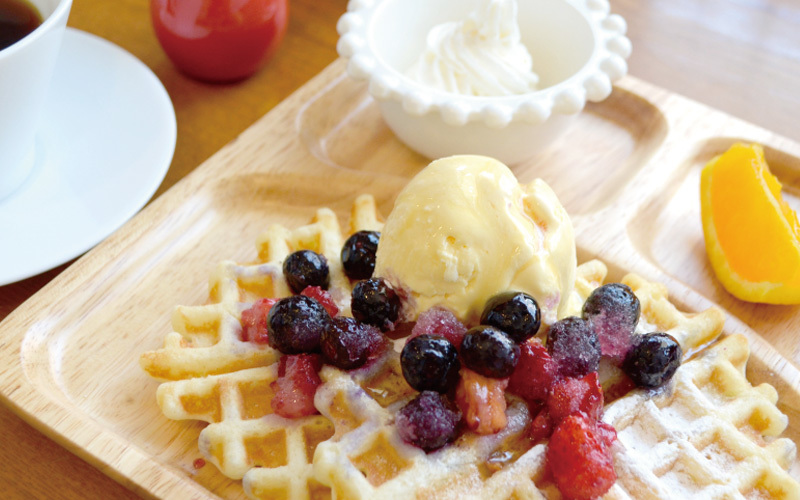 1枚ずつ丁寧に焼き上げたワッフルに、ホイップクリーム・果物・アイスクリーム・ミックスベリーをのせた、いちばん豪華なワッフルのメニュー。